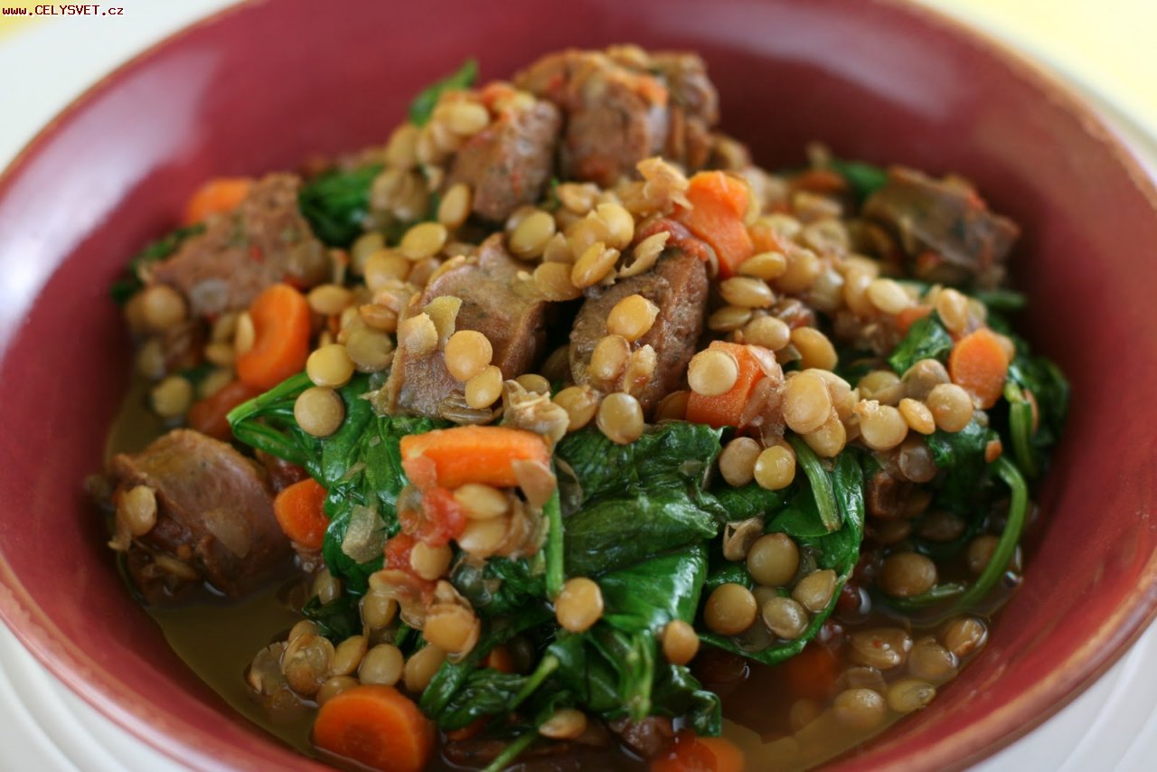 Postup přípravy: Krok 1: V žáruvzdorné míse opečeme na oleji celé klobásy. Po vyjmutí je nakrájíme na silnější kolečka. Krok 2: Do zapékací mísy navrstvíme nakrájený pórek, vrstvu brambor, klobás a předem uvařené červené čočky, které osolíme, opepříme a proložíme bobkovými listy, hřebíčkem a česnekem. Horní vrstvu tvoří opět brambory. Krok 3: Přilijeme vývar, přiklopíme a 30 minut dusíme v předehřáté troubě. Krok 4: Pokrm občas zkontrolujeme, případně podlijeme. Po půlhodině sundáme poklici a necháme dopéci vrchní vrstvu brambor dozlatova. Krok 5: Rozdělíme na porce a podáváme teplé, ozdobené petrželkou. |