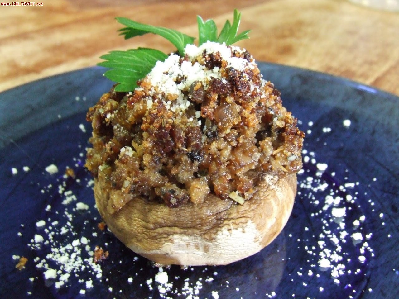 Postup přípravy: Krok 1: Na pánvi na oleji orestujeme šalotku, poté přidáme mleté maso, česnek a nakrájené nožičky žampionů. Osolíme, opepříme a přidáme chilli. Mícháme, dokud se maso neopeče. Krok 2: Vejce ušleháme, okořeníme a smícháme s ementálem a částí parmezánu. Krok 3: Vejce se sýrem a petrželku smícháme s masem.Směsí naplníme kloboučky žampionů. Krok 4: Plněné žampiony naskládáme do vymaštěné ohnivzdorné mísy a posypeme zbytkem parmezánu.Pečeme je v předehřáté troubě asi 20-30 minut. Krok 5: Pečené plněné žampiony podáváme horké, nejlépe s bramborovou kaší. |